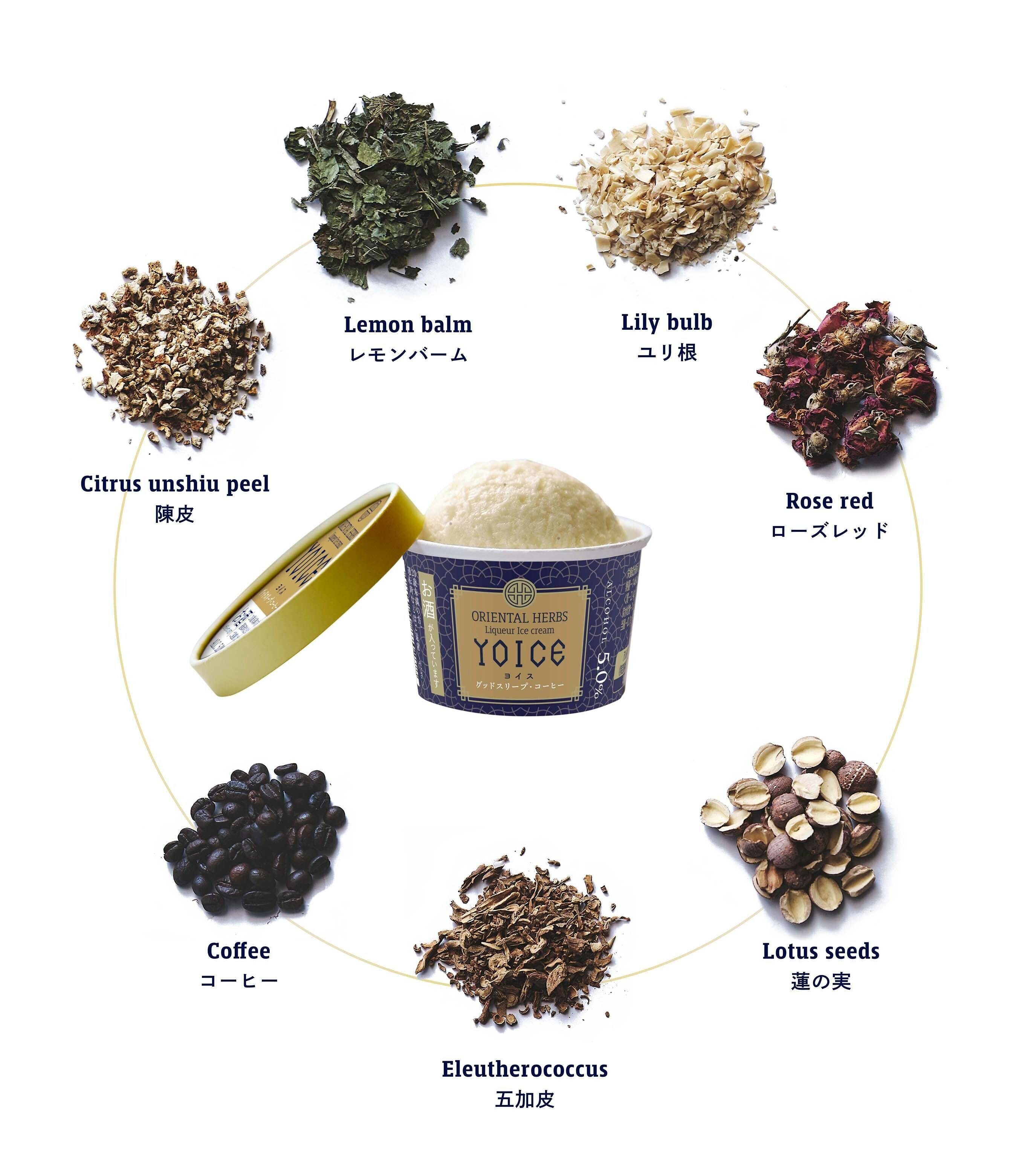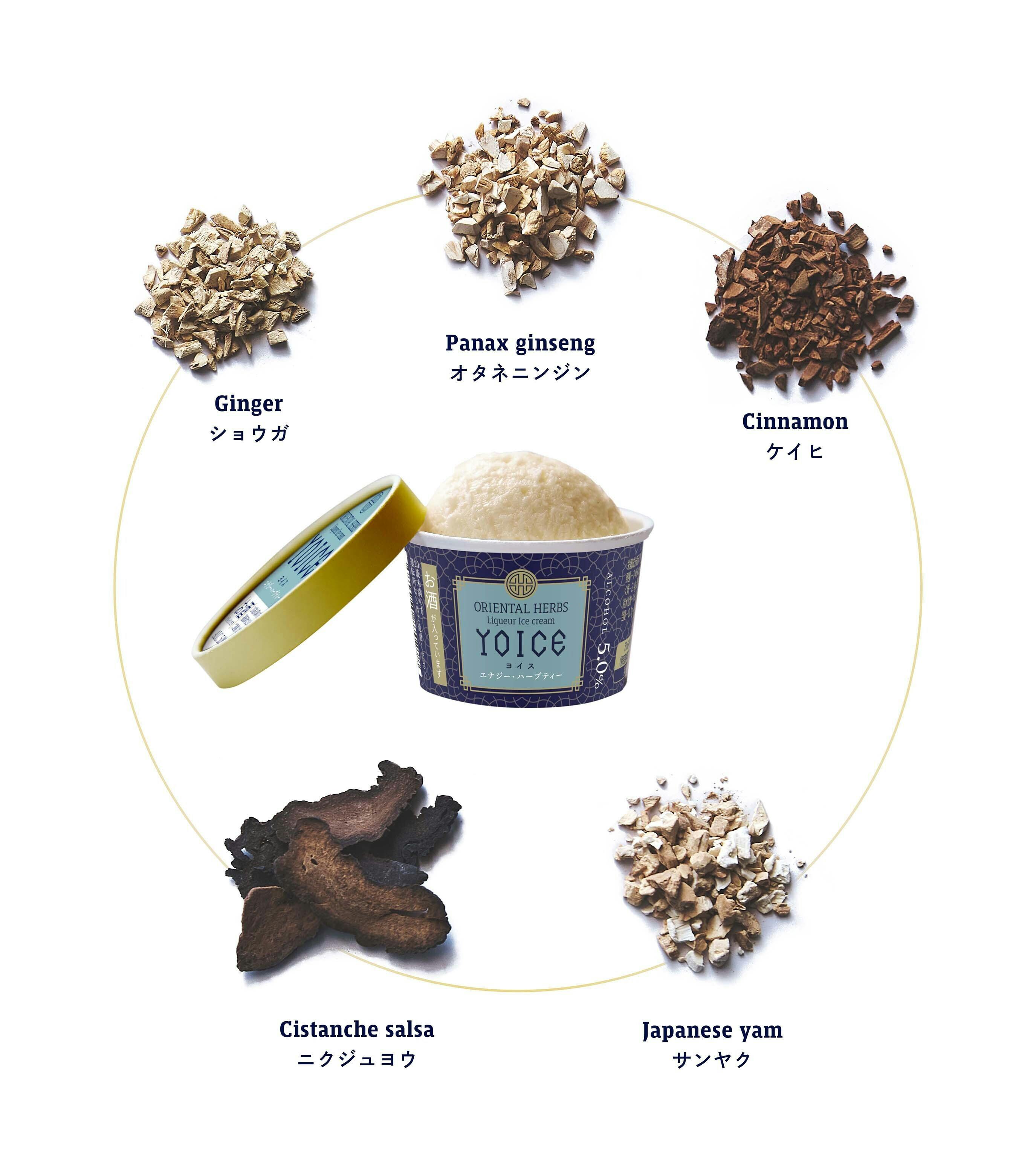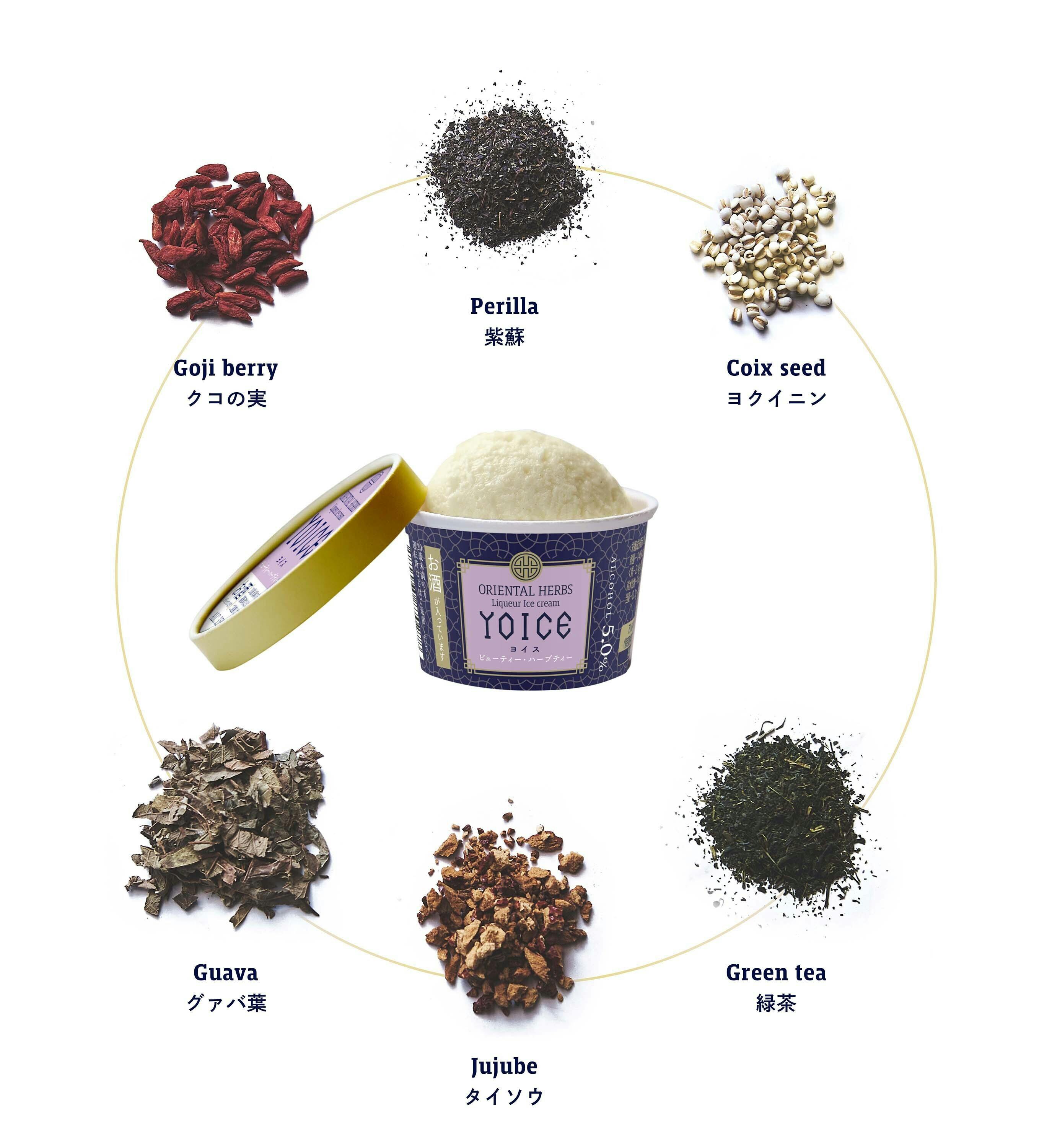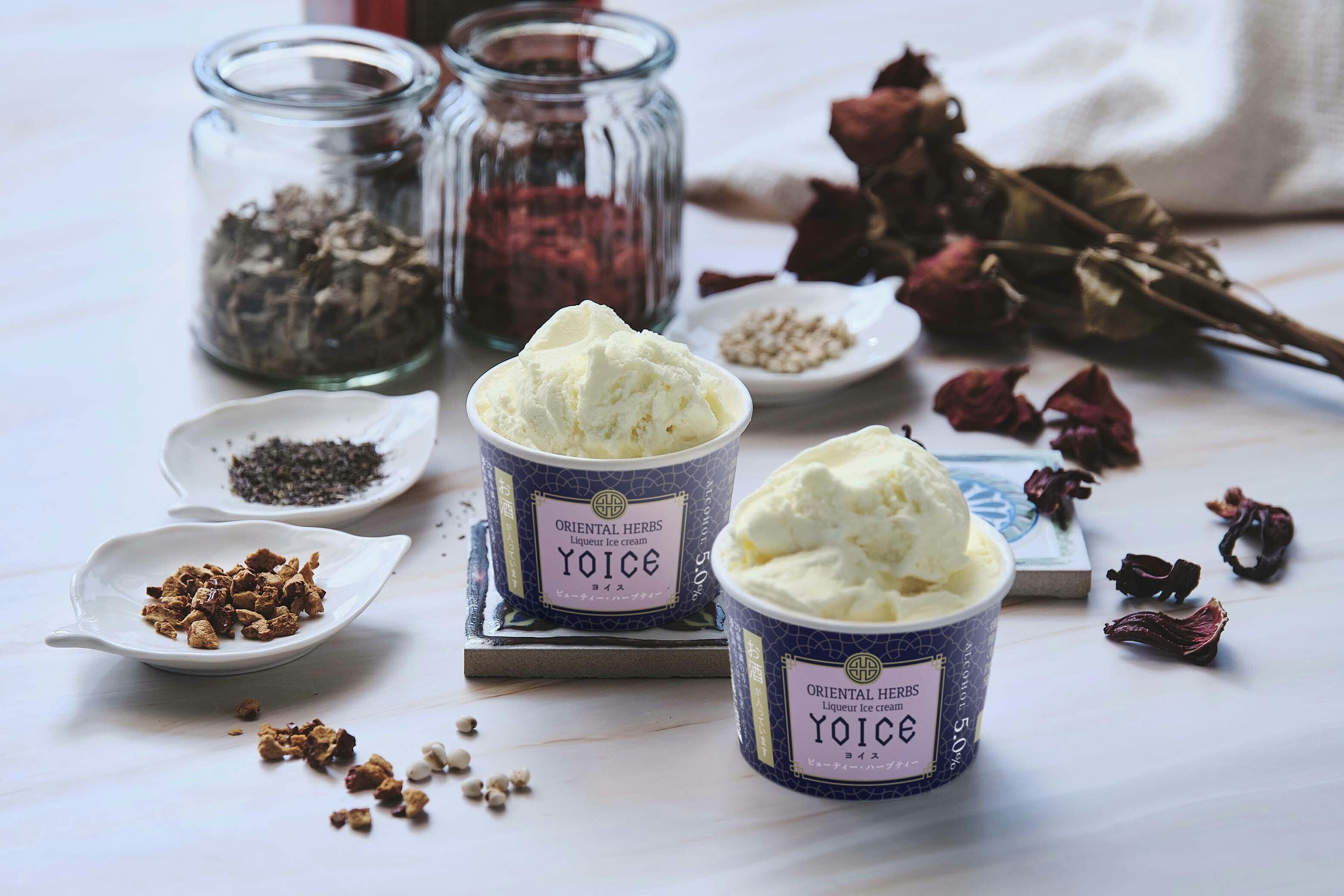 「YOICE(ヨイス)」はアルコール度数約5%のリキュールアイスクリームで、希少なハーブをふんだんに練りこみ、食べてキレイ・罪悪感のないアイスクリームを目指しました。
