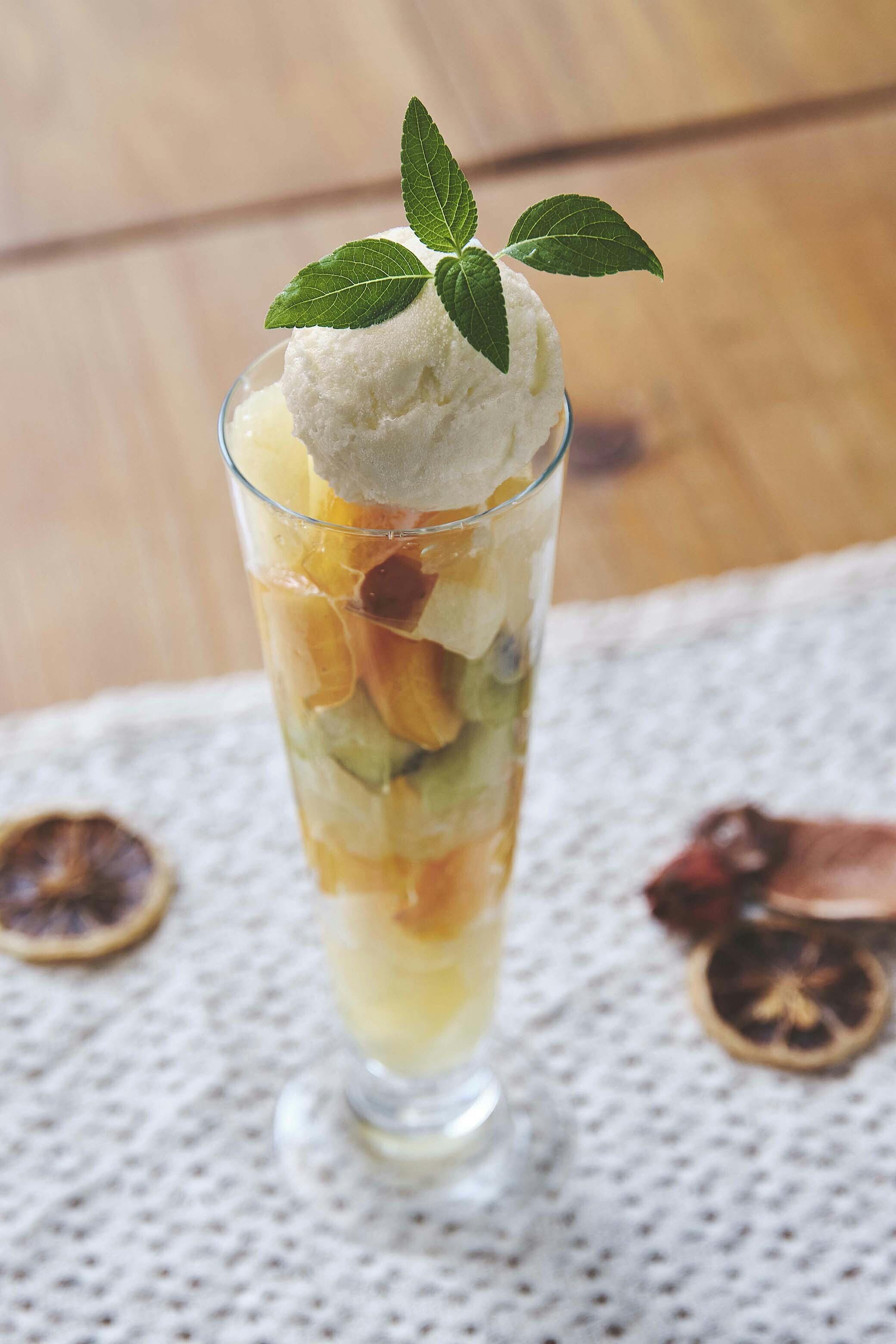 一口大のフルーツがグラスにぎっしり。エナジー・ハーブティーに、スペアミントを添える。ミントの香りに、ビタミンと刺激とみなぎるパワーをもらえます。